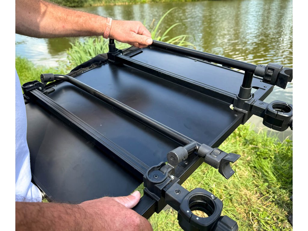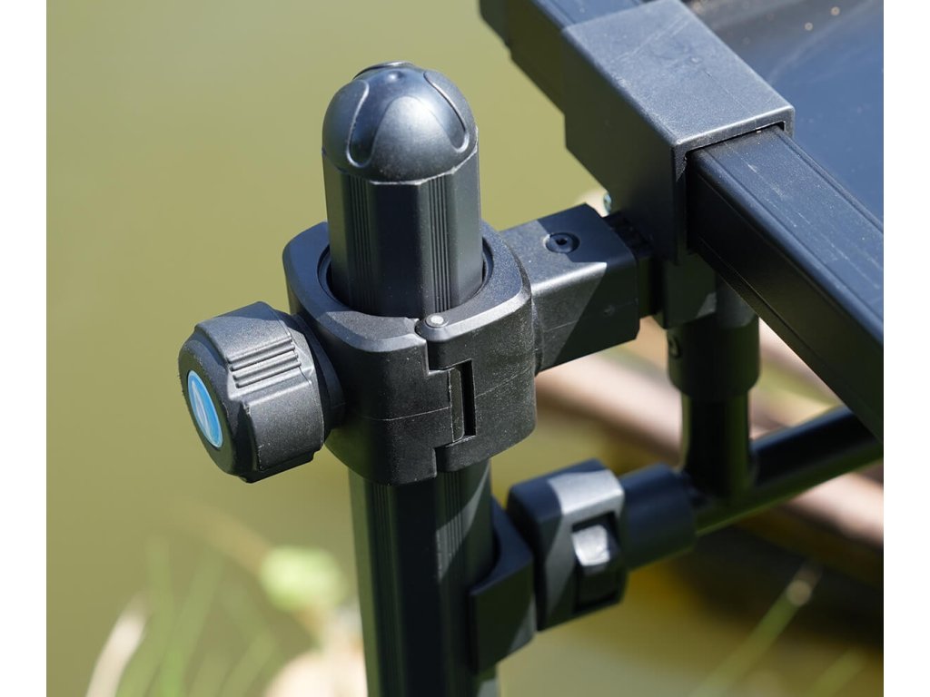 Uchytenie stolíka je vybavené dvojitým zámkom, zatiaľ čo kovová spona umožňuje úplné otvorenie bloku a jeho obtočenie okolo nohy rybárskej stoličky. Kompaktné otáčacie koliesko s neznačiacim upínacím systémom zaisťuje fixáciu stolíka vo zvolenej výške. Otvor je možné zmenšiť z 36 mm na 30 mm pomocou dodaných vložiek a polohu upínacích bodov prispôsobiť rozostupu nôh stoličky.